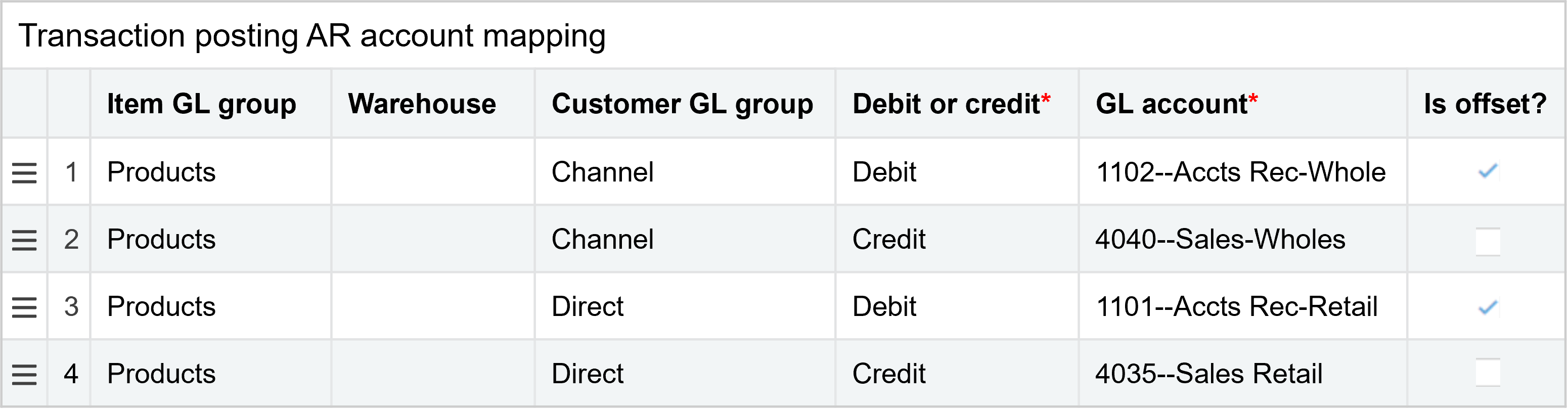 The Item GL group, Warehouse, and Customer GL group together form the criteria set for the account mapping. For example, you could have the Products item GL group, Warehouse 13, and Channel customer GL group mapped to a GL account and offset account, and the Products item GL group, Warehouse 13, and Direct customer GL group mapped to a different GL account and offset account.