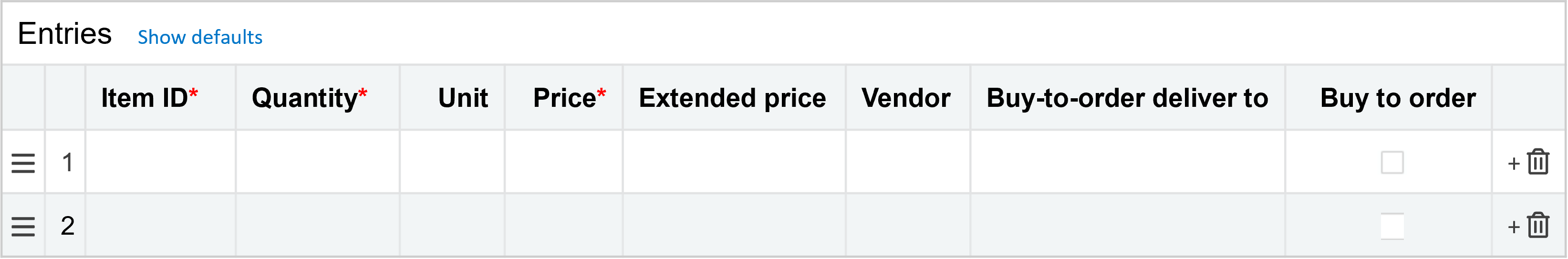 A buy-to-order item must have a price defined in a Purchasing price list for the system to create the purchase order from the sales order with purchase prices that aren't a zero amount. The Purchasing price list must be associated with either the Purchasing buy-to-order transaction definition or with the selected vendor. The best practice is to associate a default Purchasing price list with the Purchasing buy-to-order transaction definition. If the system finds a price list on the selected vendor, the vendor price list takes precedence over the default price list.