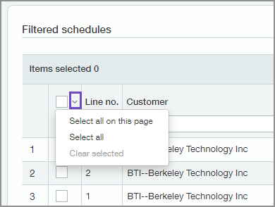 We expanded the selection options on the Manage Revenue Schedules page allowing you to select large numbers of rows efficiently. Now you can use the arrow next to the checkbox in the Filtered Schedules table header to perform the following actions: