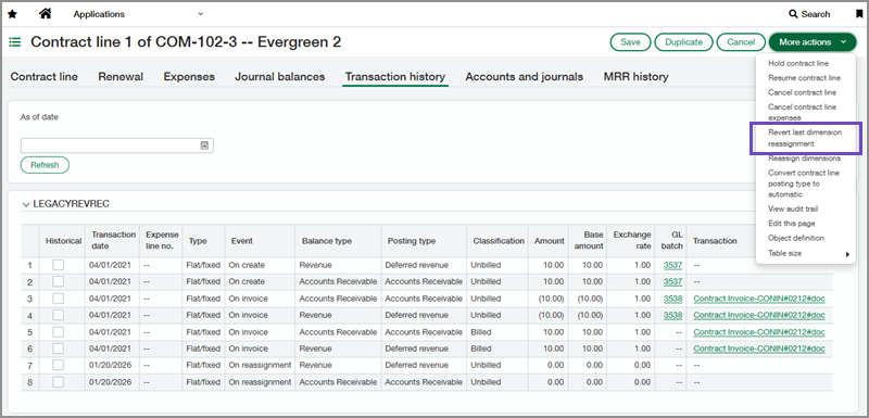 Reverting a reassignment restores the contract line's previous dimensions, removes the reassignment record from the contract line's transaction history, and deletes the associated General Ledger journal entries.